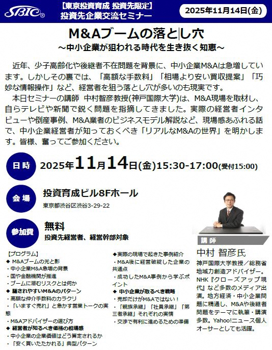 【東京投資育成 投資先限定】M&Aブームの落とし穴~中小企業が狙われる時代を生き抜く知恵~ 2025/11/14最新のM&A情報を学びつつ、トラブルを防止する