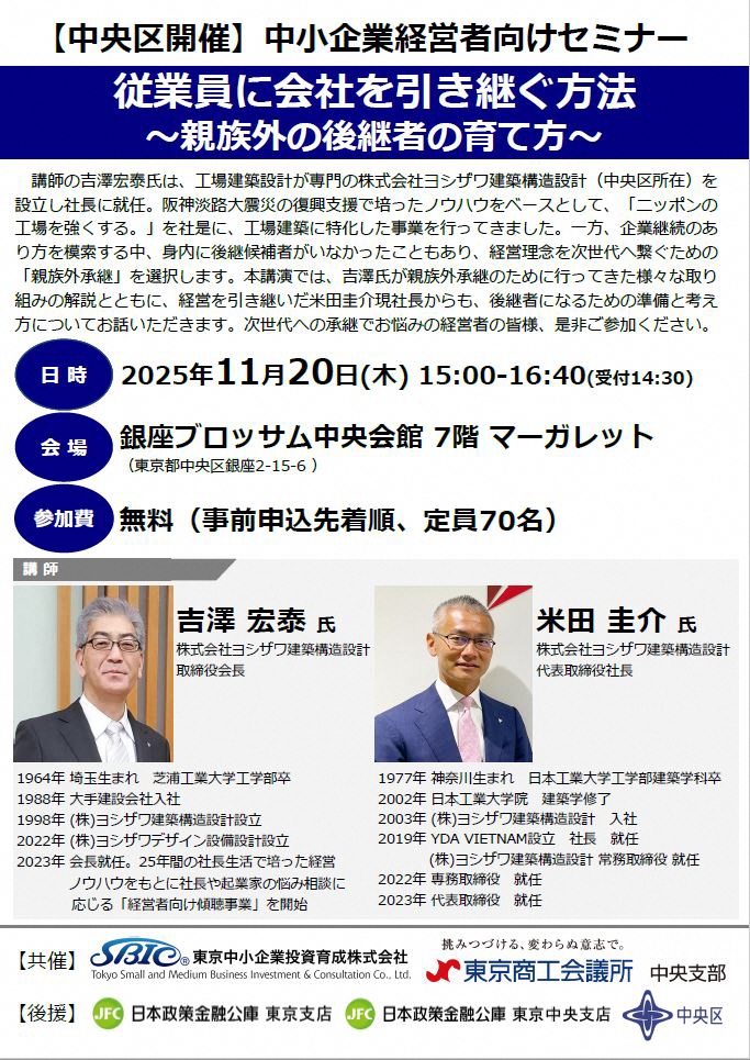 【中央区開催】「従業員に会社を引き継ぐ方法~親族外の後継者の育て方~」2025/11/20【中央区開催】「従業員に会社を引き継ぐ方法~親族外の後継者の