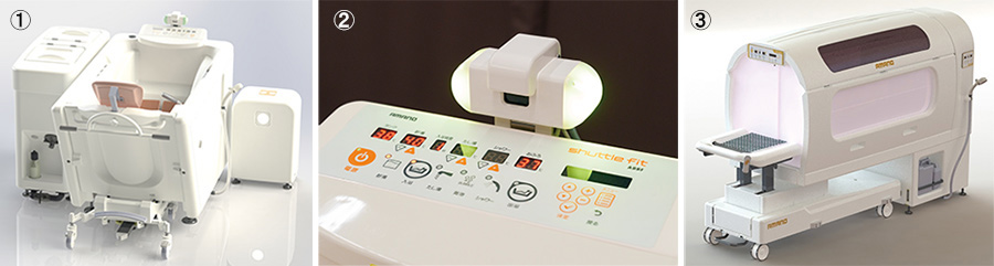専用ストレッチャーで浴槽に連結し、寝た姿勢で入浴する「寝位入浴」、専用シャワーチェアで浴槽内まで進入し、腰掛けた姿勢で入浴する「座位入浴」、リフトの座部に腰掛け、リフトを昇降して入浴する「リフト入浴」など、介護用の入浴機器には、さまざまなバリエーションが存在する。例えば「寝位入浴」の機器だけでも、ストレッチャーの動き方や浴槽のサイズなど、さらに細かく種類が分かれ、使う人それぞれのニーズに寄り添った機器が揃っている。