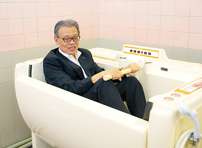 「浴槽に浸かるのではなく、複数のシャワーノズルが付いたブースに入り、全身を洗いながら入浴します。介護用入浴機器には、毎回お湯を捨てるタイプと、お湯を循環させて複数回使うタイプがありますが、シャワーの場合は1回ごとに新しいお湯を使いますから、衛生面での安心感があります。また、入浴中に溺れてしまうリスクが少ないため、安全面でも選ばれています。介助者は、常に事故の危険と隣り合わせでプレッシャーを感じていますから、負担が少しでも軽くなるという点で、ニーズが増えているのだと思います」