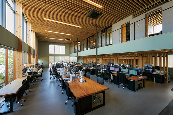 整然と積み上げられた木材から漂う清々しい木の香り。福島県にある協和木材の新オフィスは、豊かな緑に守られるように佇んでいる。林業から木製品の販売まで一貫して行う同社は、長らく工場脇のプレハブをオフィスとしてきた。プレハブの夏は暑く、冬は寒い。狭さや騒音にも悩まされていた。なにより問題だったのは、オフィスが部門ごとに点在していて連携が取りづらいという点だ。工場を最優先に資金を投じてきたため、どうしてもオフィス改善は後回しになっていたのである。