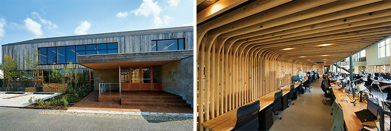 (写真左)青空に映える2階建オフィスの外観。外装には商材でもある杉の木を使用し、木材加工時に出るタンニンやリグニ