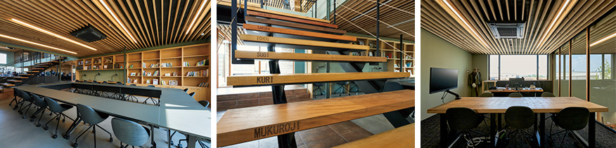 「仕事の話はもちろん、肩肘張らないコミュニケーションも大事。社長の蔵書や倉庫に保管していた森林・木材関連の書物を並べ、関心や価値観を共有できる場にもしています」と佐川専務。そのほか、給湯室や更衣室など社員目線でオフィス環境を整えていった。