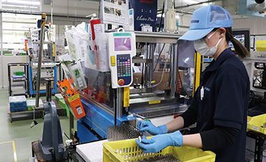 (写真左)共進の独自技術である「カシメ接合法」の作業風景。